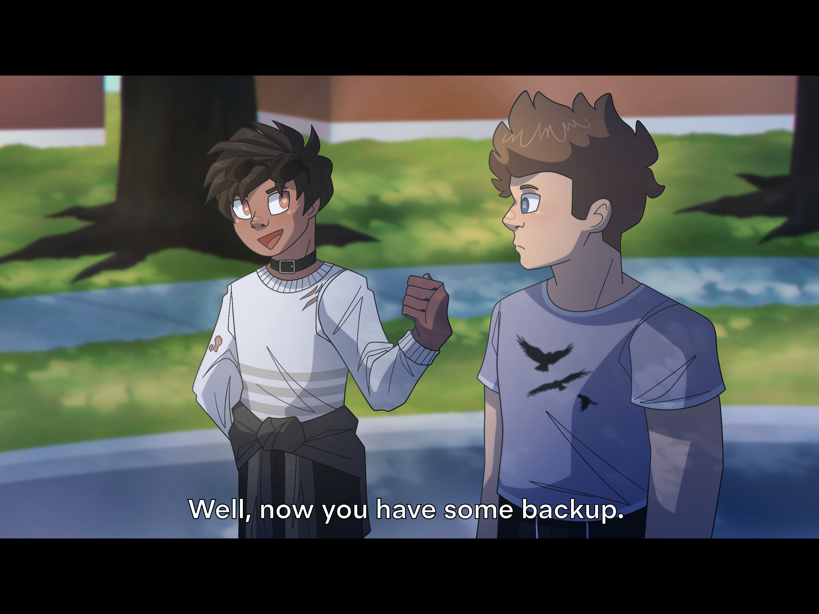“Well,” Dare said, and he looked back down at her, “that’s okay. It’s a kinda hard thing to believe, but don’t worry. I’ve believed in both of us enough to make up for it.” She grinned again, showing off tiny canine teeth. “You’ve been through so much but you always come out the other side victorious. Just like me. And I think that we always will. Cause we have each other.”