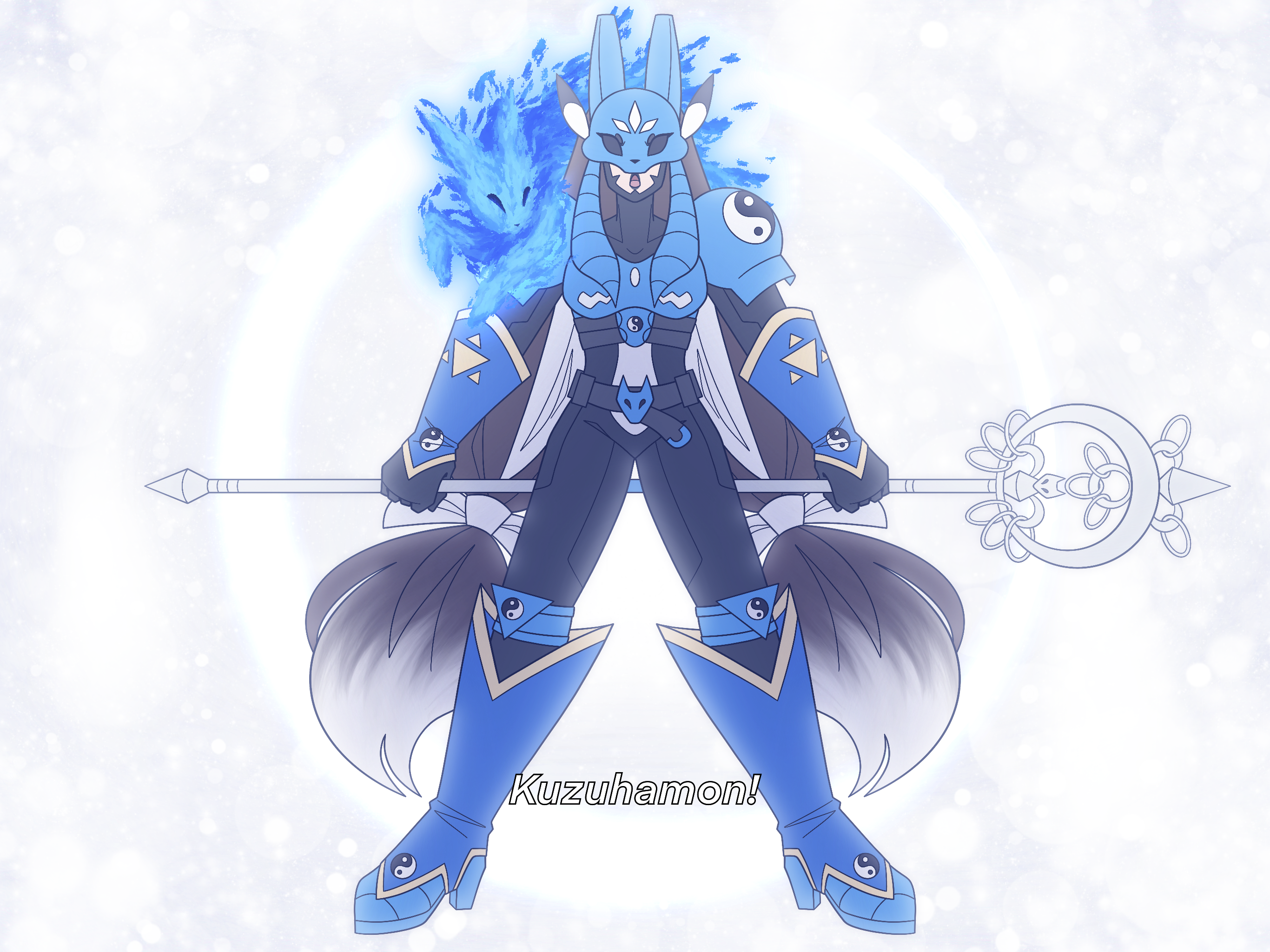She stood shorter than she had as Taomon, but twice as imposing. Covered in blue armor and a leather undersuit, she was largely humanoid, similar to Beelzemon. Her upper face was hidden by a fox-like mask, with only her mouth visible, colored with black lipstick. Her forearms and lower legs sported glove-like coverings, much like the ones she wore as Renamon, with the addition of triangular markings and yin yang symbols.