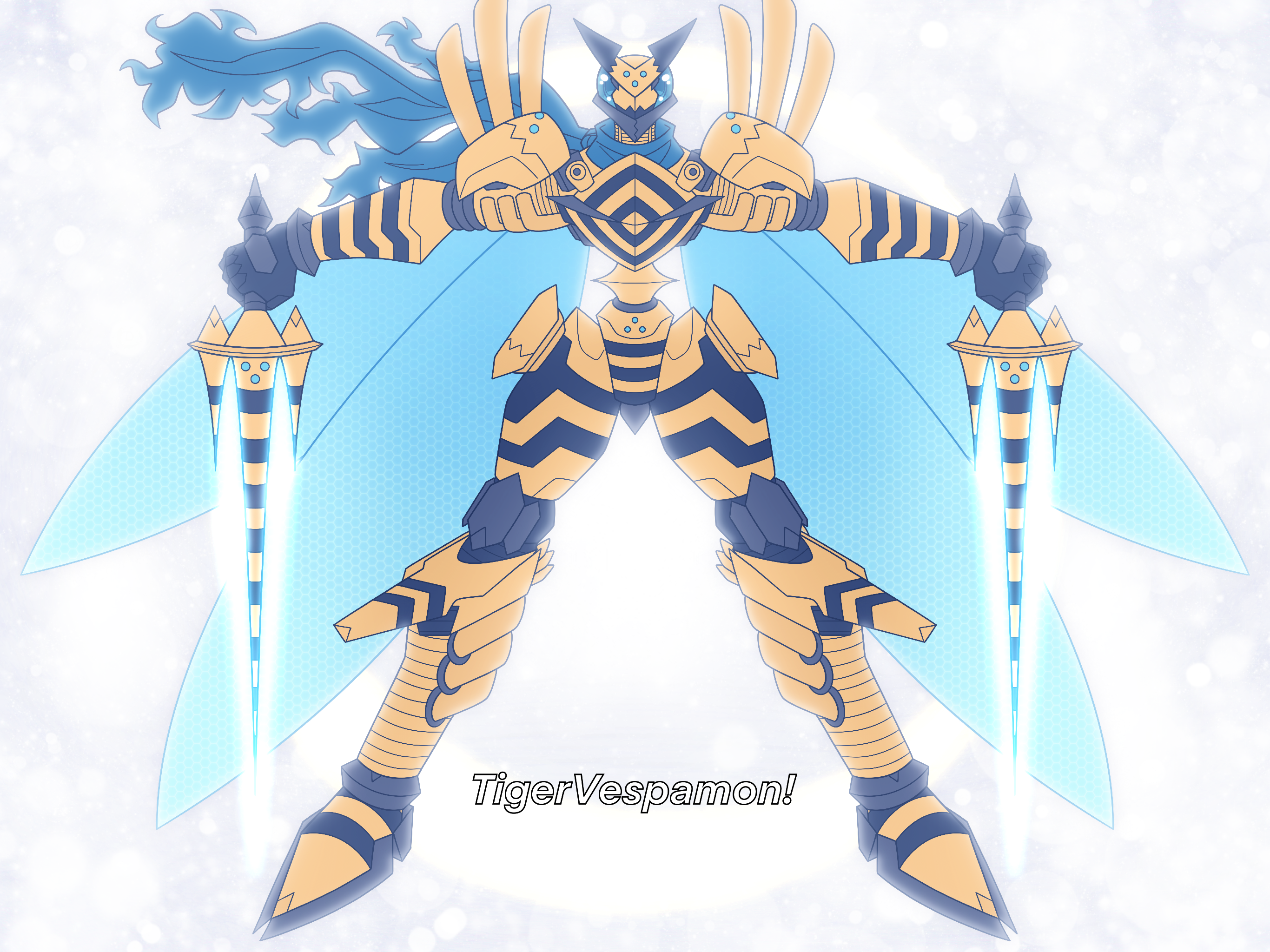 Bumble, meanwhile, was closer to some sort of cyborg wasp, if the digivice description was to be trusted, and he certainly looked the part. He stood taller than Lucemon now, and glared down at it with the cyan compound eyes positioned on either side of his head, like a true wasp. His body was composed of gold and black armor, imposing enough on its own, and it was only made more intimidating by his sharp claws, spiked feet, and V-shaped headpiece looking almost like horns. A dark blue scarf was wrapped around his neck, the tattered end fluttering out behind him as if propelled by its own personal breeze.