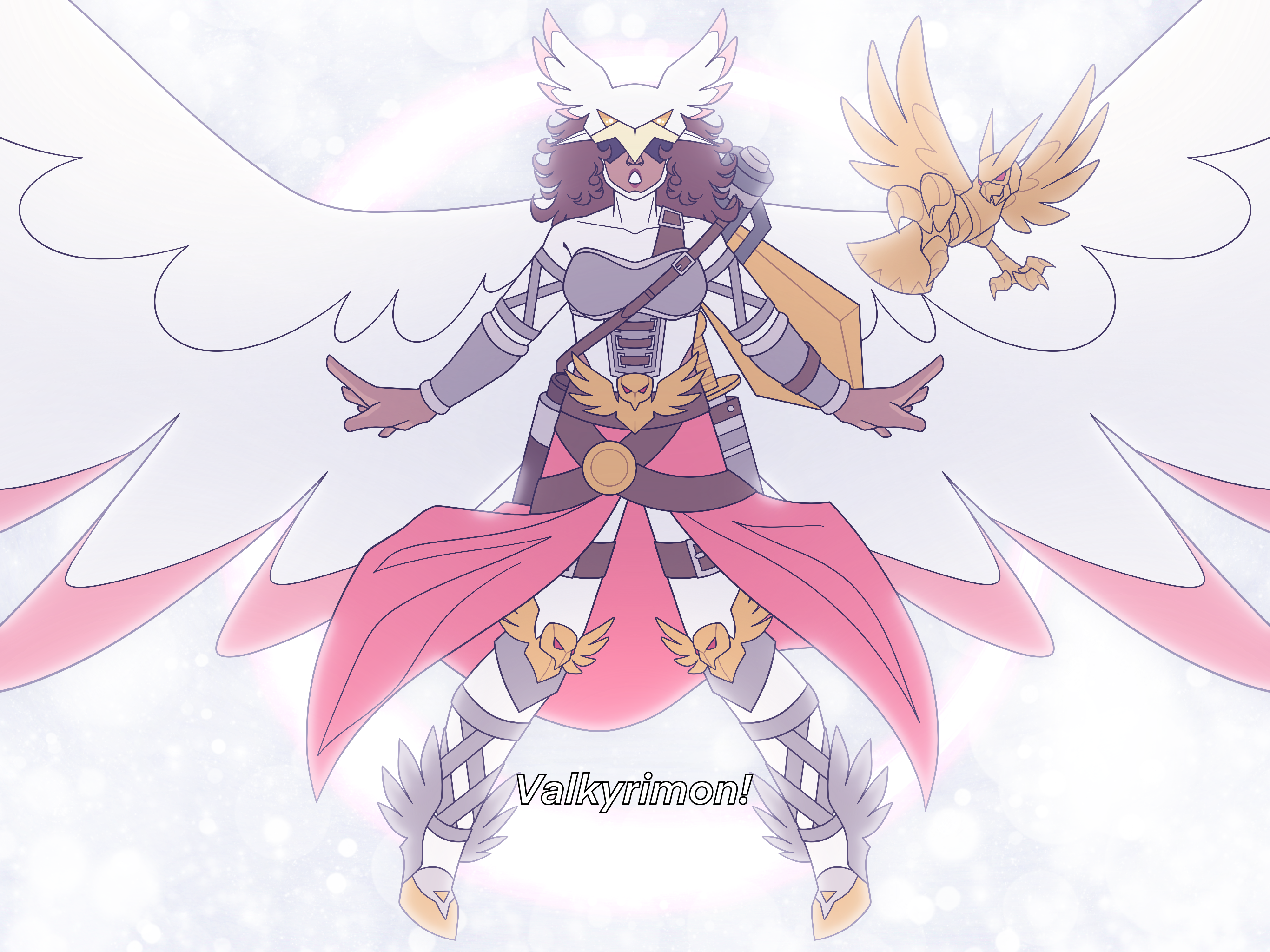 Her face was obscured by a helmet shaped like an eagle’s head, with two golden eyes set just above its beak to compensate for the pitch black visor that covered her own. Curly reddish-brown hair peeked out from under that helmet, blowing faintly in a nonexistent wind, much like the large feathered wings that burst from her back, each white feather tipped with pink. She tilted her head at Lucemon, clenching one of her fists, the forearm of which braced a diamond-shaped shield, then raised her opposite hand to the sky. With a hawk’s cry, a small golden bird swooped in from out of nowhere, then perched on Pop’s fist, its eyes fixed on Lucemon.